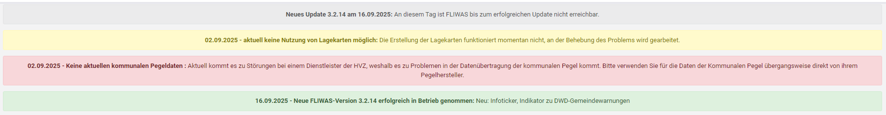 Die neue FLIWAS Version 3.2.14 wurde am 16.09.2025 erfolgreich in Betrieb genommen. Als wichtigste Neuerungen stellen wir Ihnen im Folgenden den Infoticker und den Indikator für DWD-Wetterwarnungen auf Gemeindeebene vor.