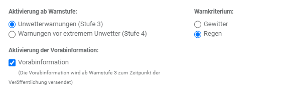 Mit der aktuellen Version 3.2.14 wurde diese Funktion erweitert, so dass Sie diese Indikatoren nun gemeindescharf einrichten können. Wie bei den Landkreiswarnungen können Sie auch hier entscheiden, über welche Warnstufen (Vorabinformation Unwetter, Unwetterwarnung, Warnung vor extremem Unwetter) und welches Warnkriterium (Gewitter oder Regen) Sie informiert werden möchten.
