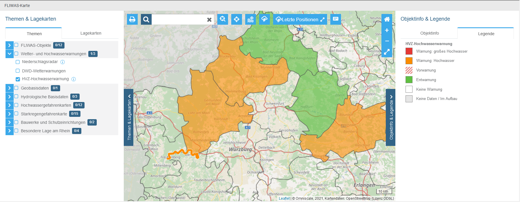 Auch im Hinblick auf die Kartenthemen (früher „Layer“ genannt) gab es einige Verbesserungen. Die Auswahl der anzuzeigenden Themen erfolgt nun in einer neu gestalteten Randleiste auf der linken Seite. Gleichzeitig wurde die Themenauswahl übersichtlicher gestaltet und um einige interessante Themen erweitert. Unter anderem können Sie neben dem aktuellen Radarbild nun auf zwei weitere Echtzeitthemen zugreifen: Die Warnkarten des Deutschen Wetterdienstes und der Hochwasservorhersagezentralen geben einen schnellen Überblick über die jeweils aktuelle Warnsituation und aktualisieren sich automatisch. Auch die Starkregengefahrenkarten sind – soweit örtlich bereits vorhanden – nun in FLIWAS verfügbar.